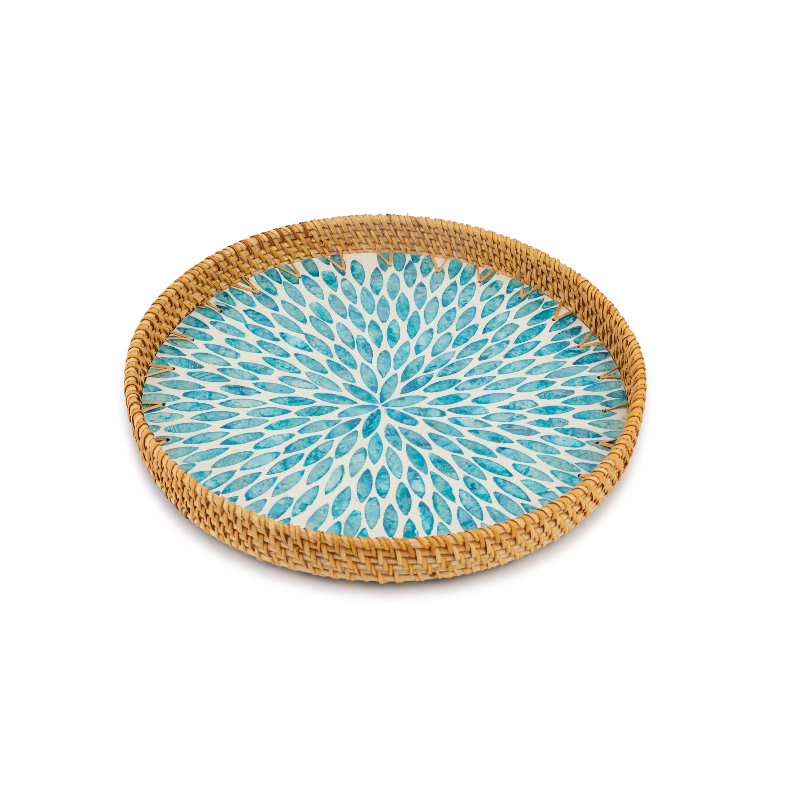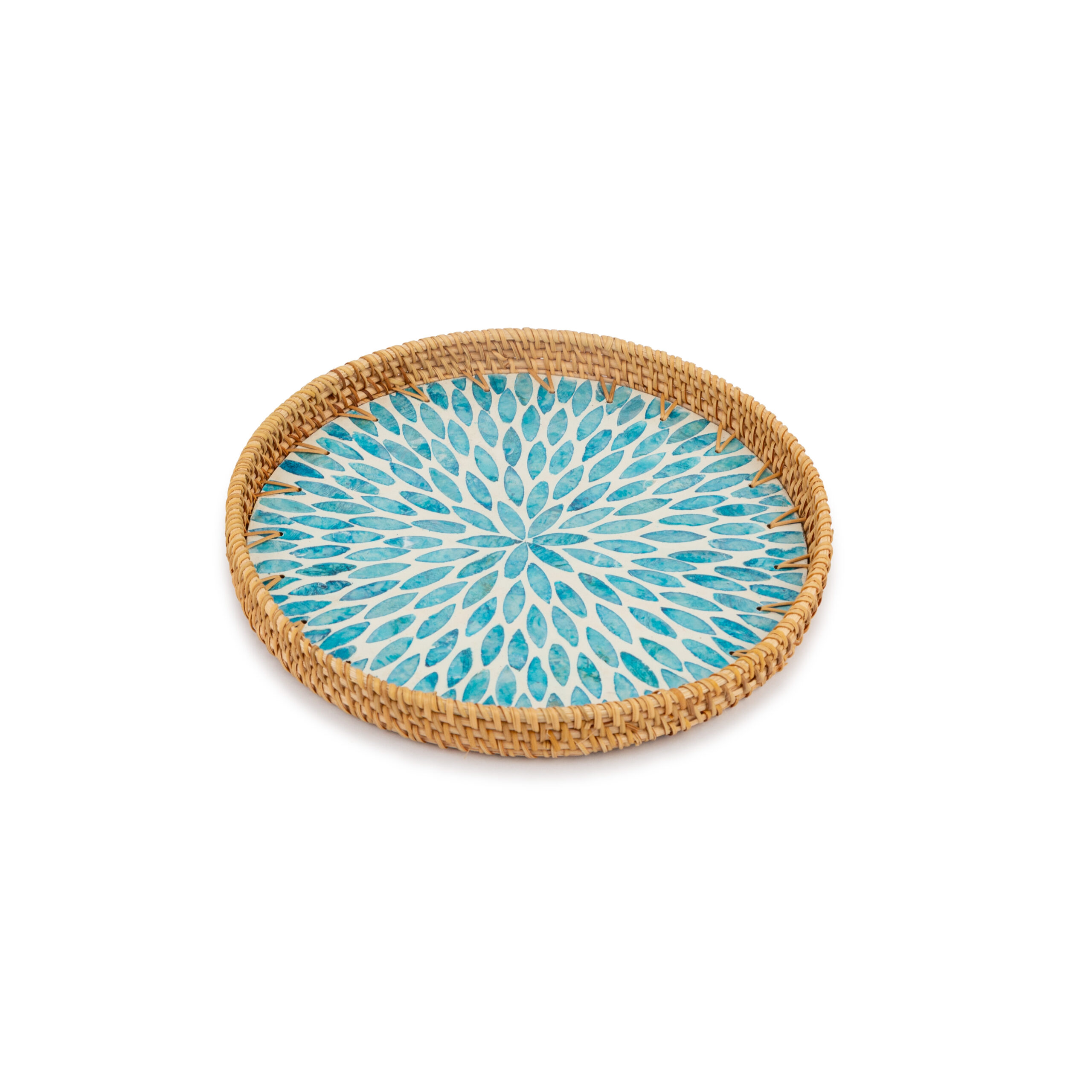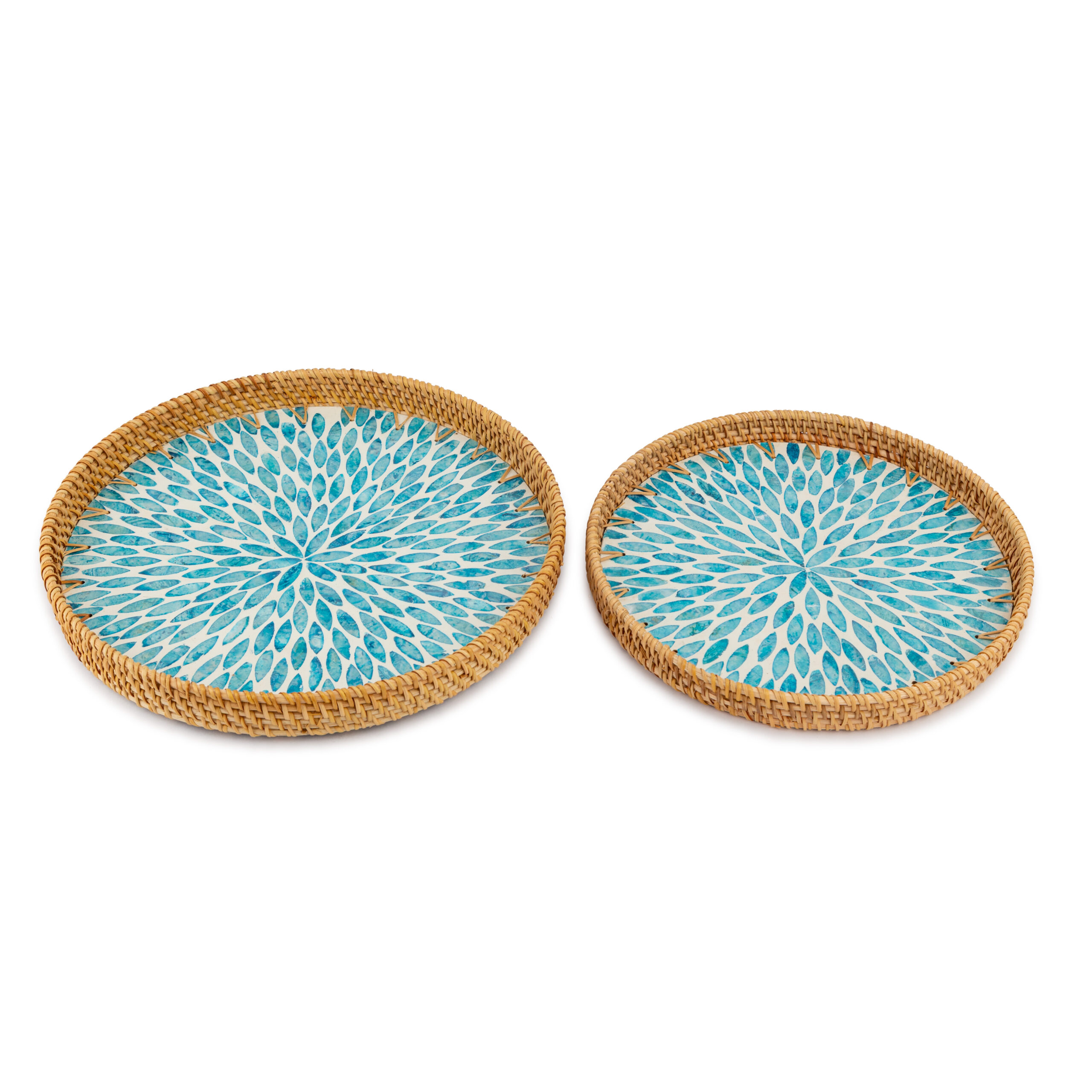 Eleve o nível da sua decoração com o Kit Bandeja Decorativa Mori em Rattan e Madrepérola. Este conjunto exclusivo de duas peças é uma verdadeira obra de arte funcional, que combina a calidez natural do rattan trançado à mão com a elegância atemporal de um mosaico em madrepérola. O centro de cada bandeja apresenta um padrão geométrico que remete a pétalas, em tons vibrantes de azul e turquesa, criando um ponto de luz e sofisticação em qualquer superfície.