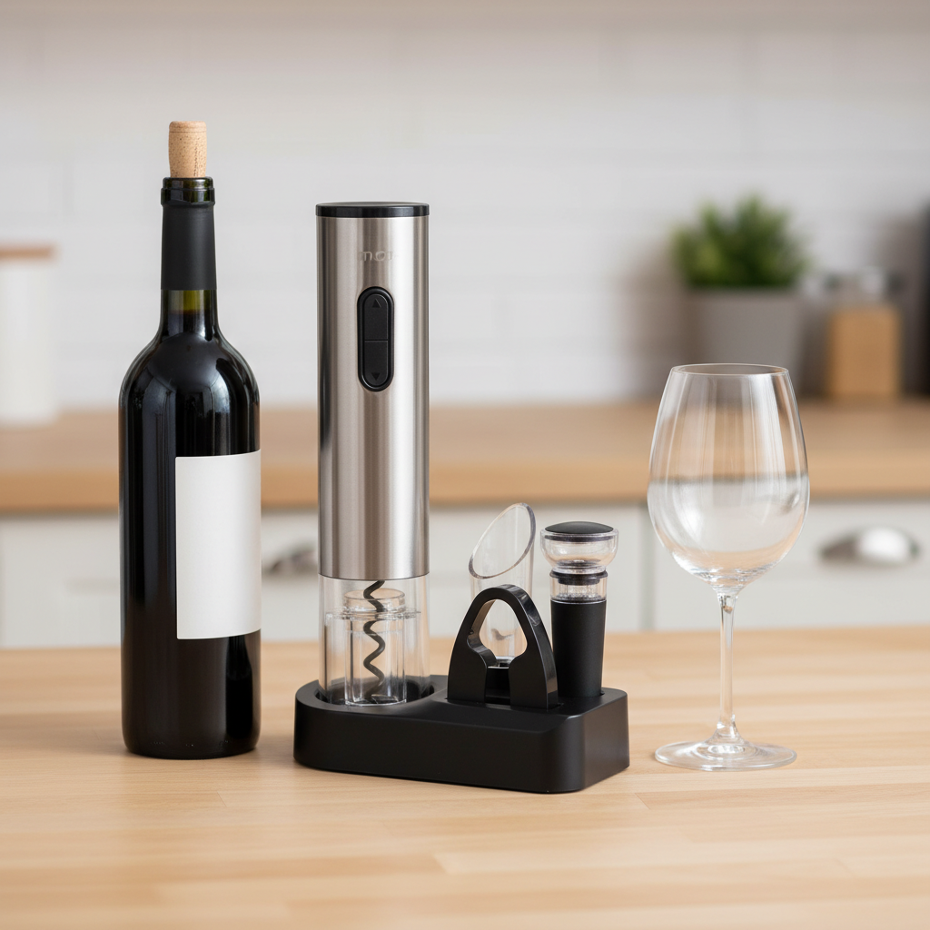 O Abridor de Vinho Automático com Kit Completo é a escolha perfeita para os amantes de vinho. Este conjunto abrangente inclui 1 abridor automático, 1 cortador de lacre, 1 aerador e 1 tampa à vácuo, proporcionando todas as ferramentas necessárias para uma experiência de vinho aprimorada. Com uma base em plástico durável, o abridor opera com 4 pilhas AA (não inclusas), garantindo praticidade sem a necessidade de fios. Este kit é uma solução conveniente e elegante para abrir, servir e preservar suas garrafas de vinho com facilidade.