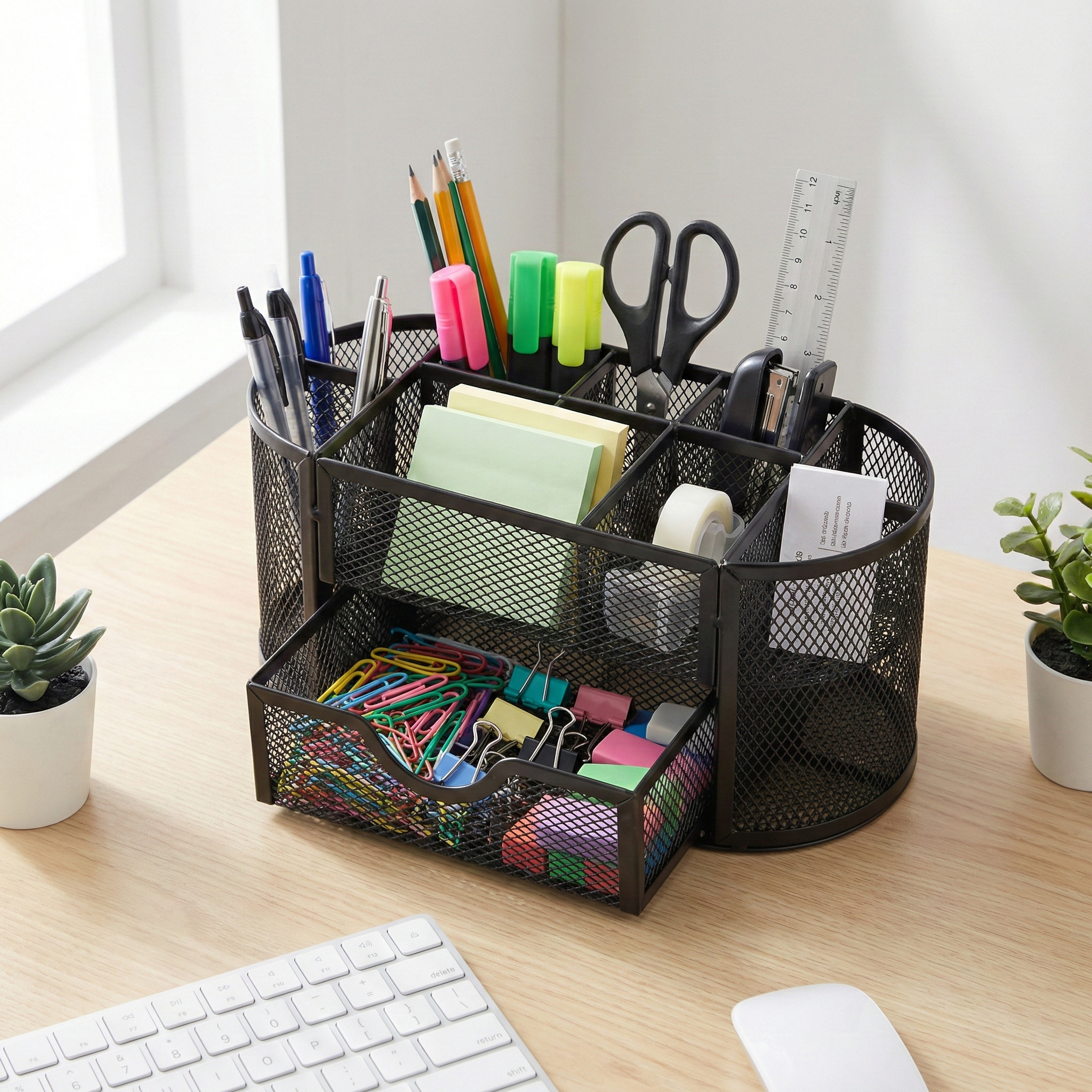 O organizador de mesa de malha metálica é prático e multifuncional, ideal para manter a mesa limpa e organizada. Possui bordas arredondadas e formato oval, oferecendo mais segurança e facilidade no uso. Conta com uma gaveta deslizante que amplia o espaço de armazenamento e quatro almofadas protetoras na base, evitando danos à superfície. Fabricado em metal resistente, é durável e perfeito para uso em escritórios e escolas, armazenando canetas, lápis, crachás, cadernos, tesouras e outros itens essenciais.