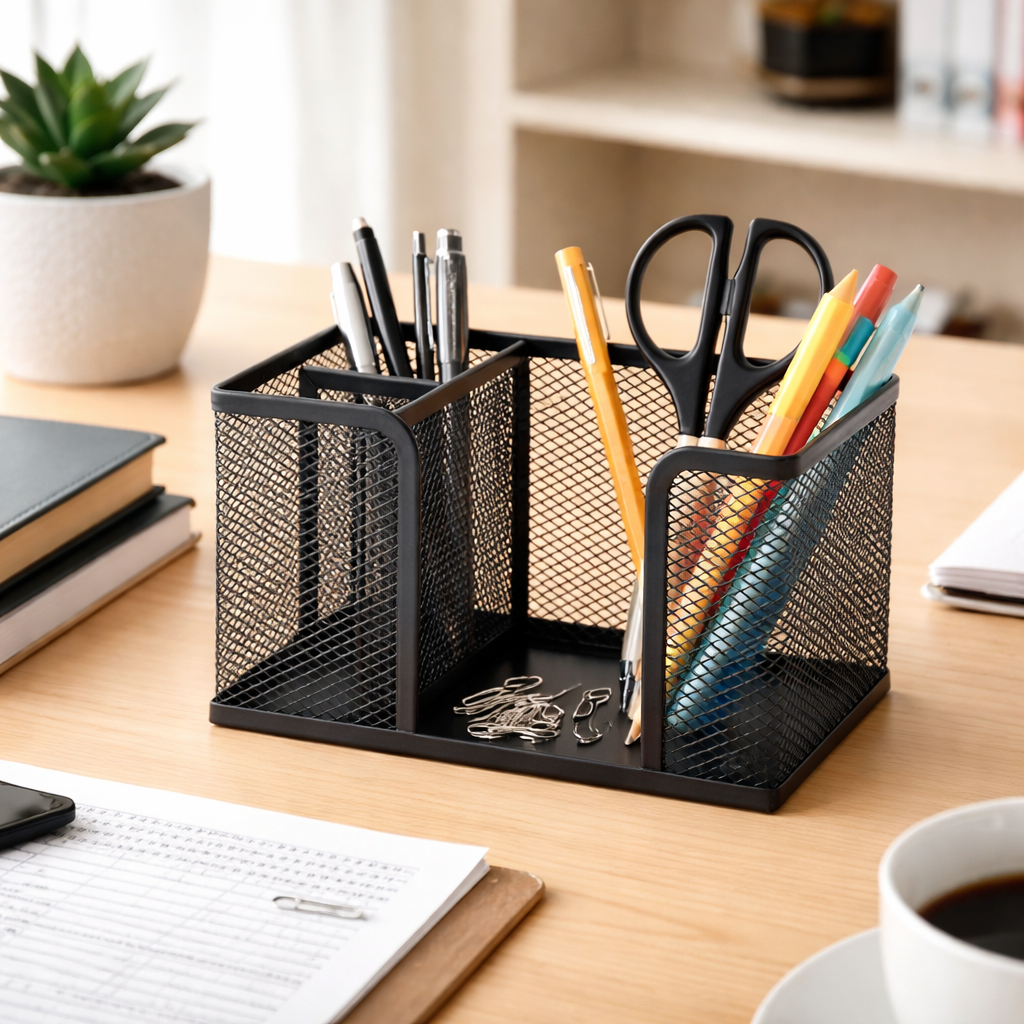 Deixe sua estação de trabalho mais funcional e estilosa com o Organizador de Mesa em metal telado! Com dois compartimentos e um porta-rascunho, ele é perfeito para armazenar canetas, blocos de anotações, rasunho e outros acessórios. Seu design moderno em aço resistente com acabamento preto garante durabilidade e um toque sofisticado para qualquer ambiente de trabalho.