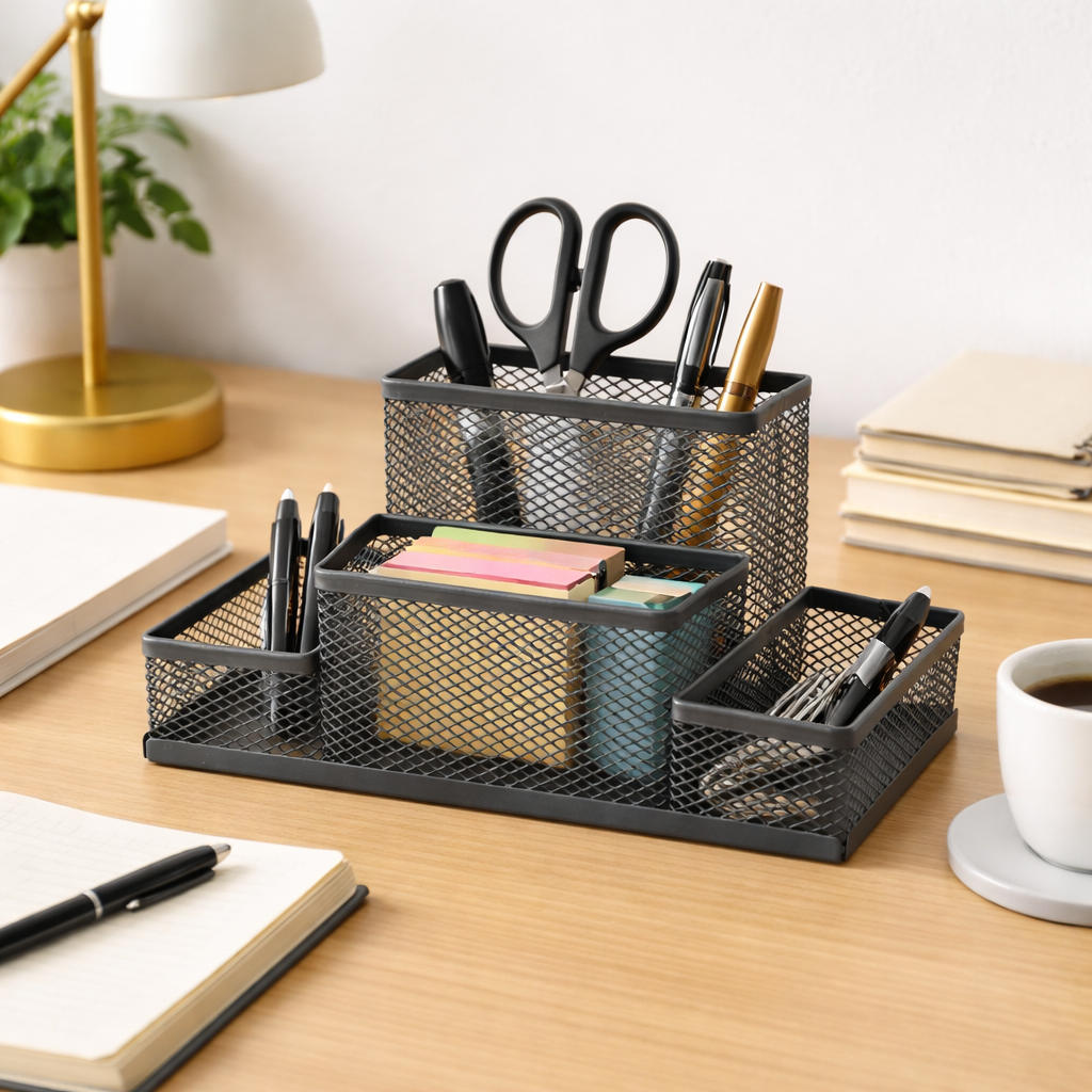 Organizador de Mesa em Metal Telado com 4 Compartimentos Deixe sua estação de trabalho mais funcional e estilosa com o Organizador de Mesa em metal telado! Com quatro compartimentos, ele é perfeito para armazenar canetas, blocos de anotações, rasunho e outros acessórios. Seu design moderno em aço resistente com acabamento preto garante durabilidade e um toque sofisticado para qualquer ambiente de trabalho.