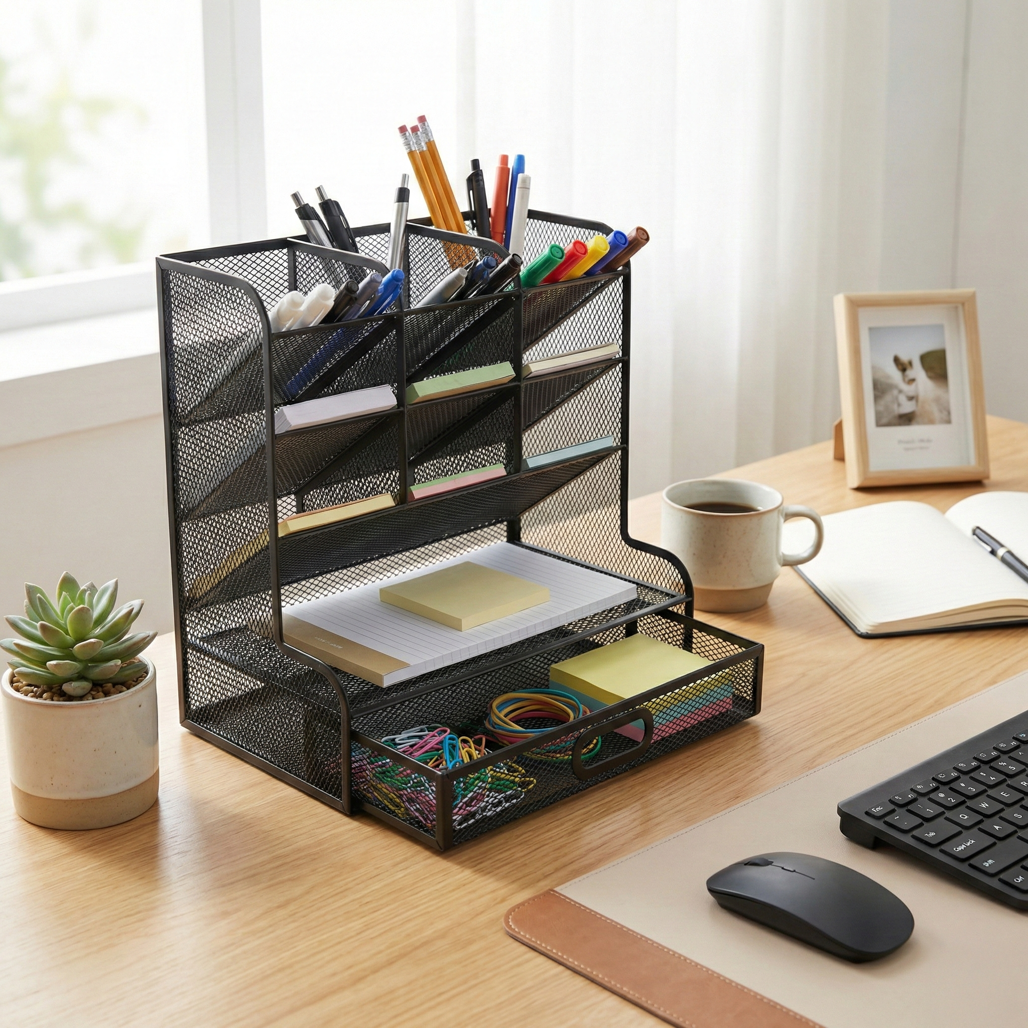 Organizador de Mesa em Metal Telado com 9 Compartimentos e 1 Gaveta Maximize sua produtividade com o Organizador de Mesa em metal telado! Com nove compartimentos variados e uma gaveta espaçosa, ele oferece organização inteligente para documentos, correspondências, canetas e acessórios. Fabricado em aço resistente com acabamento preto elegante, combina durabilidade, funcionalidade e um design moderno que valoriza qualquer espaço de trabalho.
