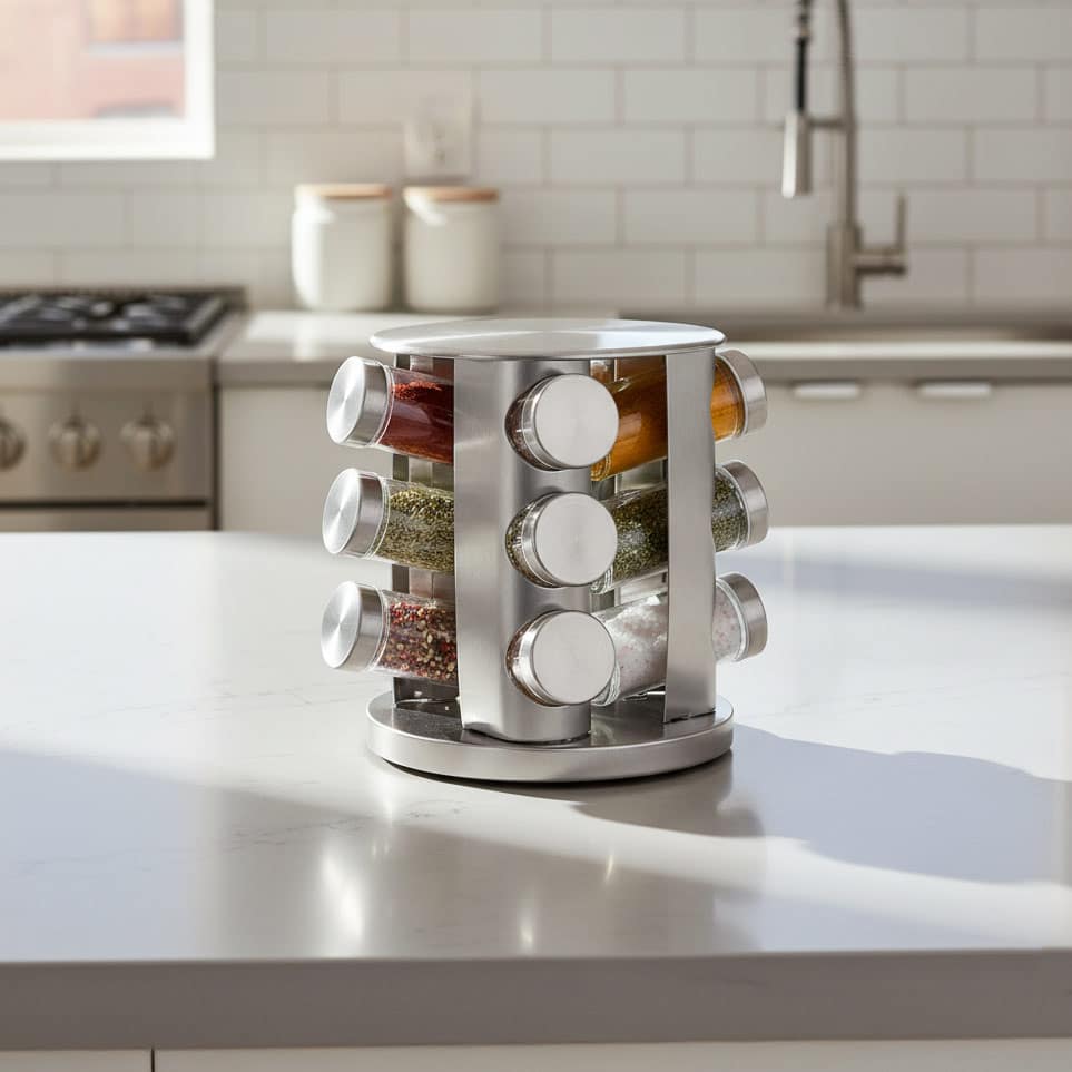 O Porta Tempero Condimento Inox Vidro Giratório para Cozinha é uma solução prática e elegante para organizar seus temperos. Com base giratória, você pode acessar todos os 12 potes facilmente. Feito de vidro e metal inox, possui acabamento em aço escovado, proporcionando sofisticação à sua cozinha.