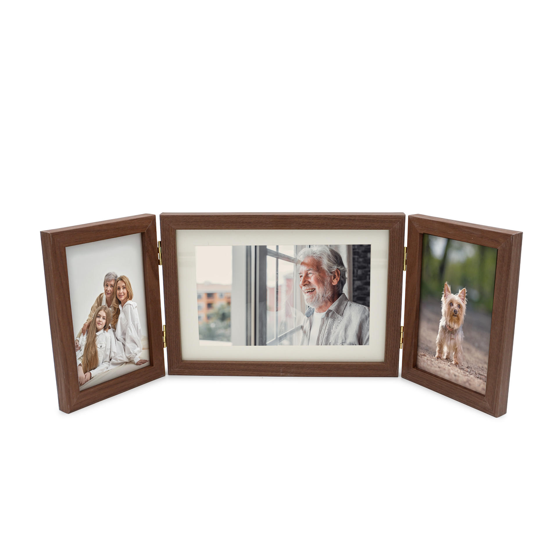 O porta-retrato comporta três fotos, sendo duas no tamanho 10 × 15 cm (laterais) e uma no tamanho 20 × 15 cm (central), valorizando a imagem principal. Sua estrutura articulada possibilita ajustar o ângulo das molduras, oferecendo versatilidade na exposição e adaptação ao espaço.